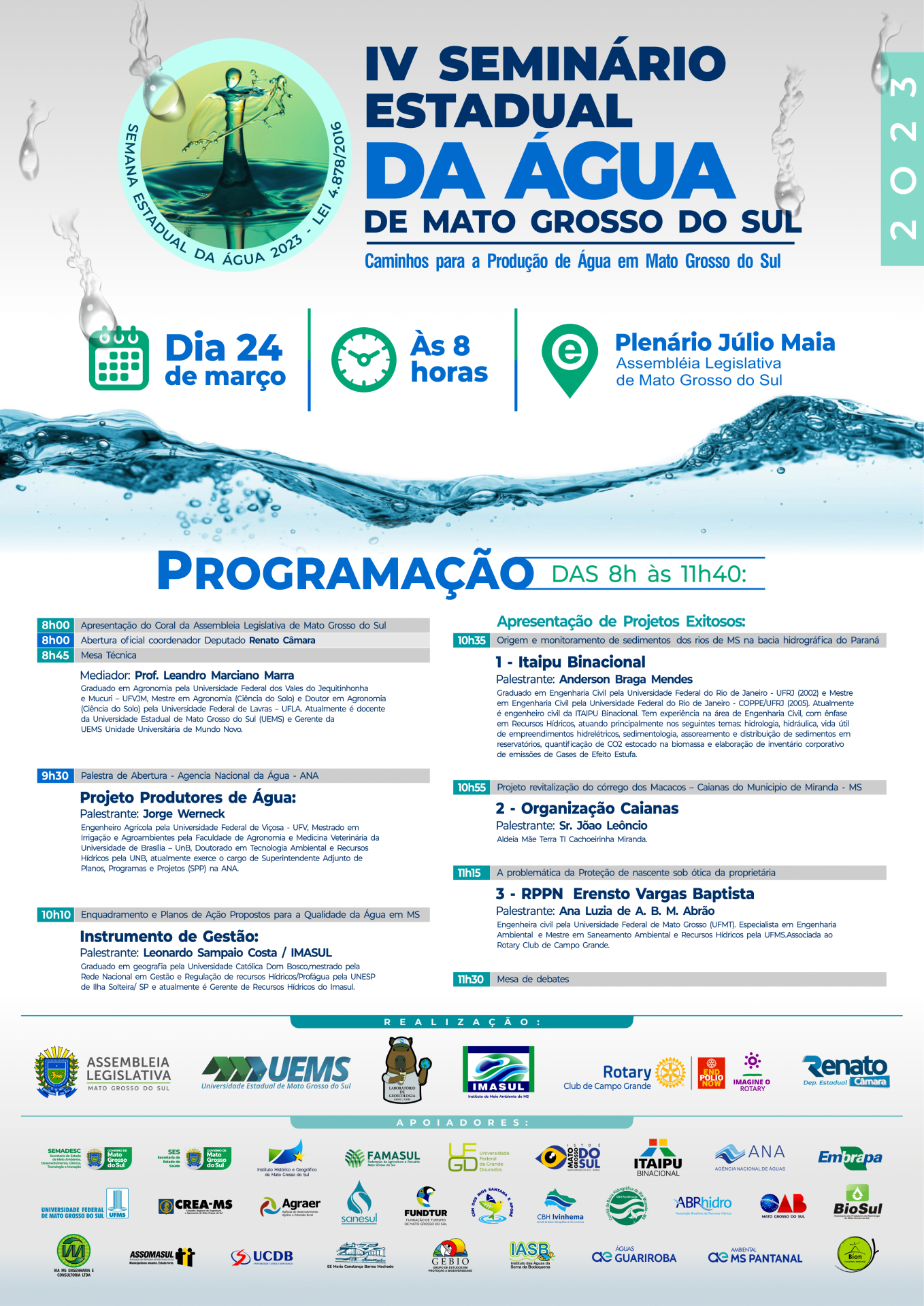 “Este é o quarto seminário consecutivo no qual o Rotary Club de Campo Grande figura como um dos organizadores do evento, sendo a temática importante para a sociedade de Mato Grosso do Sul e para os rotarianos, pois está alinhada com a Sétima Área de Enfoque do Rotary International. Neste ano o tema enfoca a produção de água, a proteção de nascentes, buscando sensibilizar a respeito dos cuidados que todos devemos ter com a nossa água, um bem tão precioso, bem como mostrar a relevância da Educação Ambiental”, explica Ricardo Zanin, presidente do Rotary Club de Campo Grande.